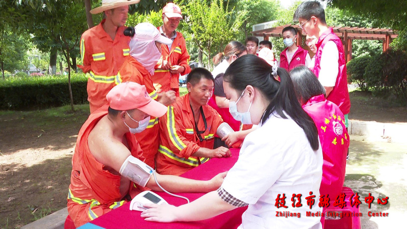 活动中,医务志愿者耐心细致地为在场的环卫工人进行免费健康咨询、测量血压、血糖等检查,并针对高温下如何进行自我防护提供指导。同时,大学生志愿者为他们送上了“清凉爱心礼包”。