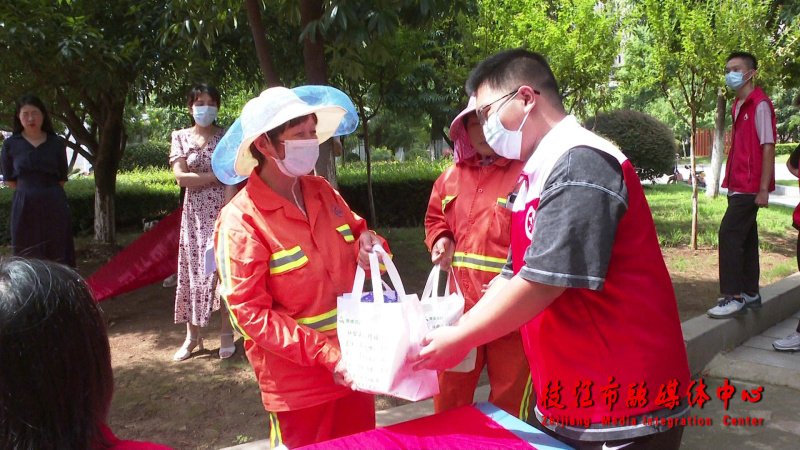 枝江融媒(记者 徐露)不惧高温,坚守岗位,烈日下,环卫工人的身影令人敬佩。7月22日,丹阳社区组织志愿者开展“高温在头顶,关爱在我心”系列活动,为环卫工人送上清凉和关爱。