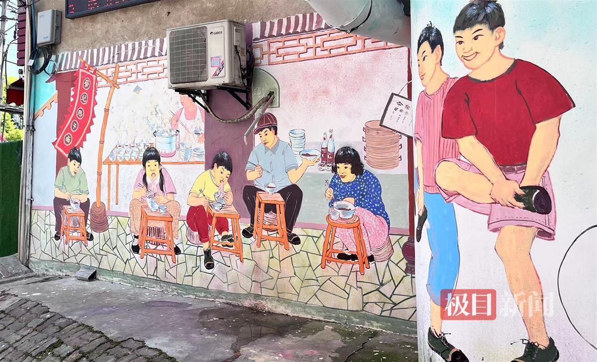 “我家里曾经也有这样的老式缝纫机。”王阿姨一边看一边炫耀着诉说。沿着墙画延伸方向欣赏,随着居民手中的蒲扇起落,带着美好回忆的笑声和着夏日蝉鸣一道,从巷子深处传来。“这些画都是一代人的记忆啊。”常远青望着远去的背影说道。