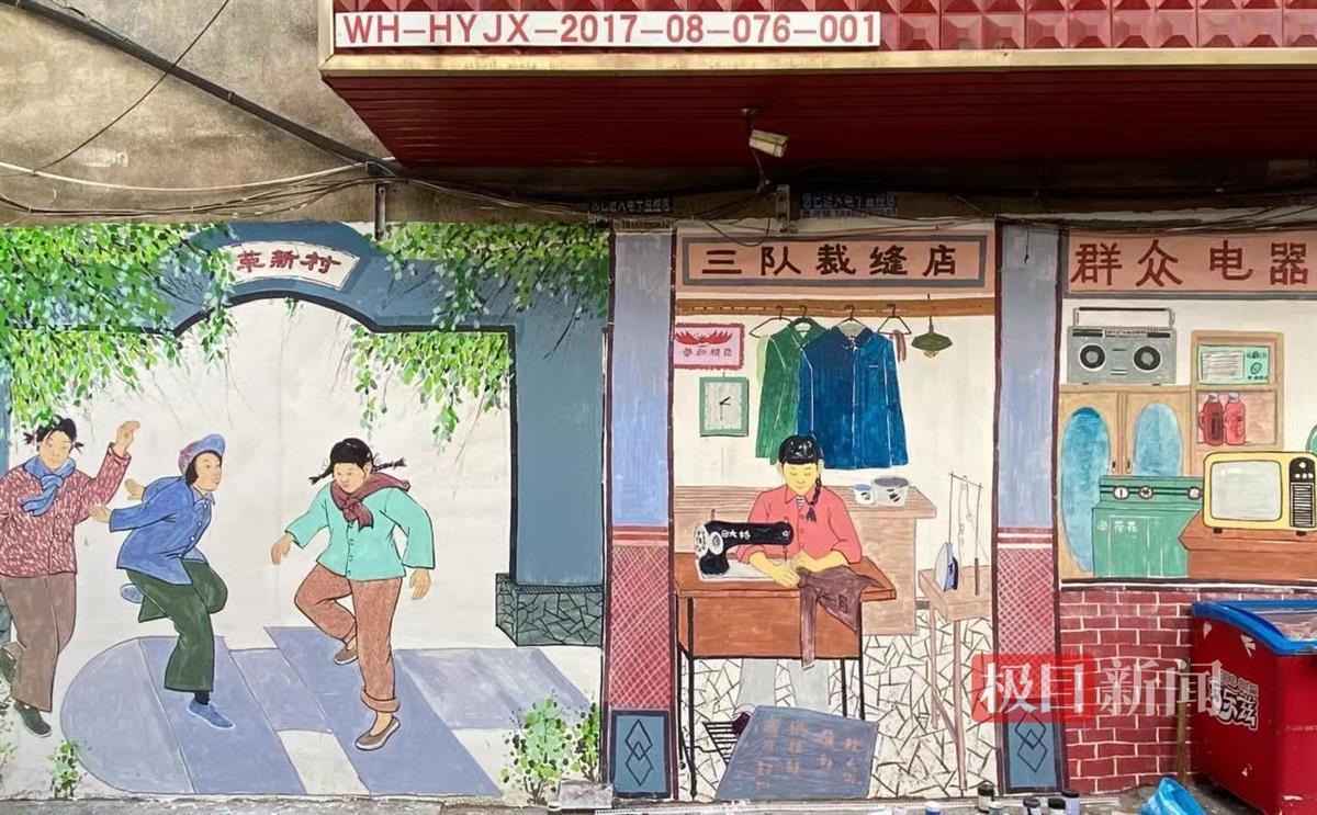 荷花牌洗衣机、扬子江冰棍、红星挎包、老式缝纫机……武汉东西湖长青街道革新社区革新三队的小巷里,常远青和同伴郑国栋用近一个月的时间,在近400平方米的墙面上尽情挥洒笔墨,一幅幅具有年代感、小巷特色的画作徐徐铺展开来。