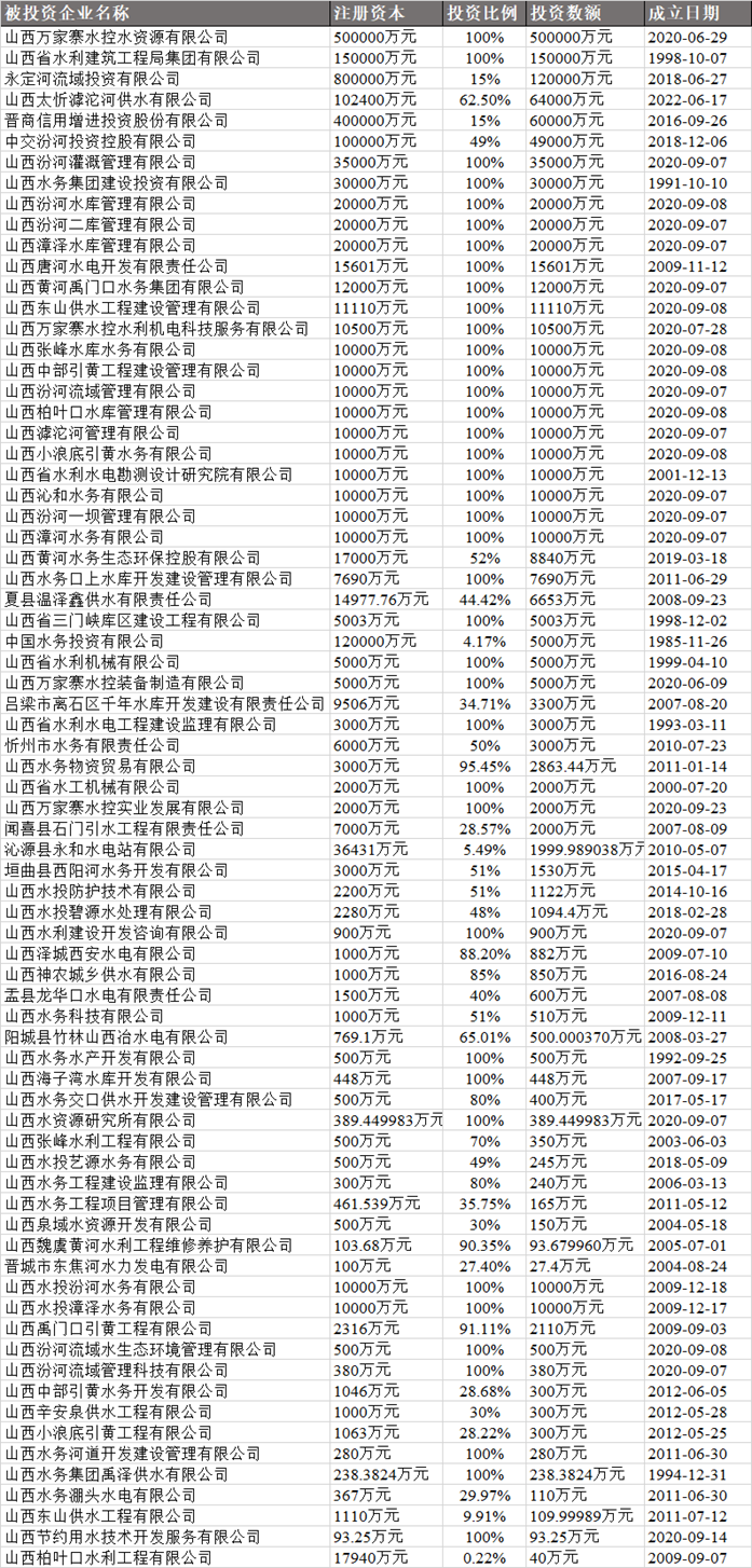 据中国水网从企查查了解到,目前万家寨水控集团目前对外投资企业有74家,如下表所示,为74家公司相关信息。
