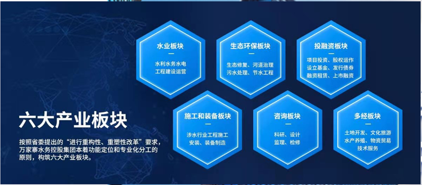 据万家寨水控集团官网显示,目前产业板块主要包括六大内容:水业板块、生态环保板块、投融资板块、施工和装备板块、咨询板块、多经板块。
