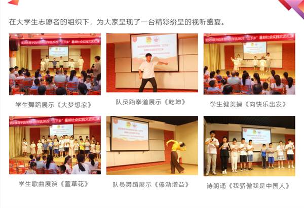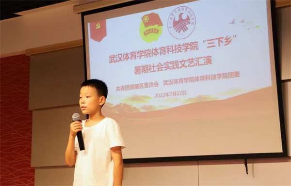 7月22日下午,武汉体育学院体育科技学院“三下乡”社会实践团在黄陂区龙潭青少年空间开展文艺汇演活动,为期12天的暑期社会实践生活画上圆满句号。