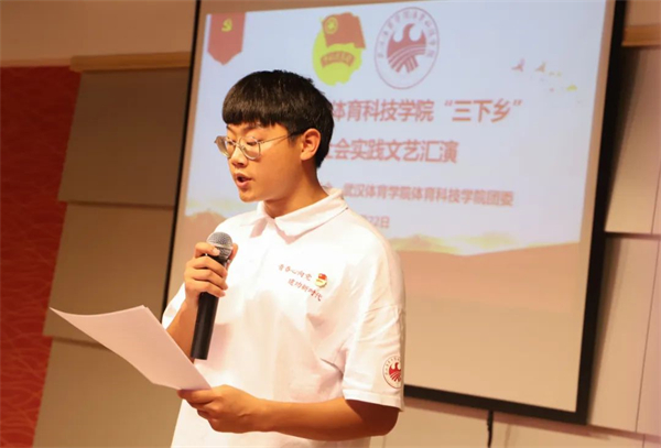武汉体育学院体育科技学院“三下乡”实践团队员尹乐伟在分享时讲道:“这次短暂而又充实的社会实践活动,拉近了我们与社会的距离,明确了我们青年学生的成才之路与肩负的历史使命,是我人生中的一段重要经历,将不断地去激励着我持续奋斗”。