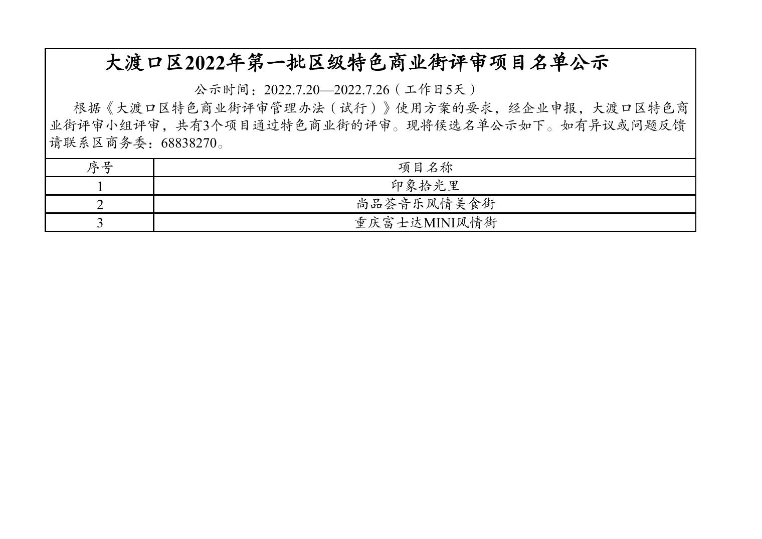 大渡口区2022年第一批区级特色商业街评审项目名单公示