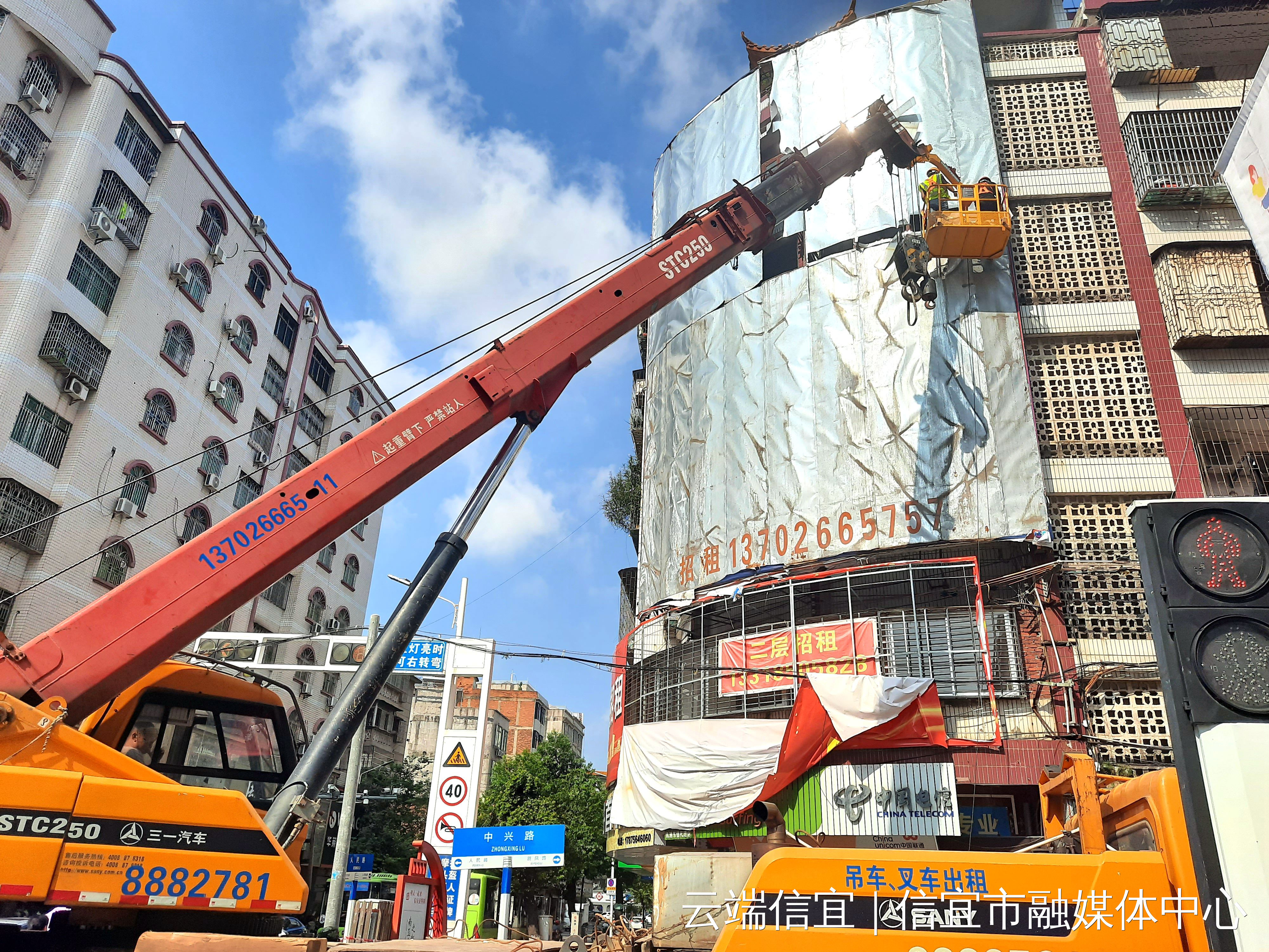 7月26日上午,在位于中兴街口和东兴街口两处楼房外墙以盖窗、盖阳台违规搭建的三块大型广告牌处,市城管执法人员现场围起安全警戒线,调来大型吊机协助清拆,工作人员站上塔笼作业,首先拆卸掉广告图布,然后用电锯逐一拆除广告牌铁皮面板、框架、广告照明灯具等搭建物。