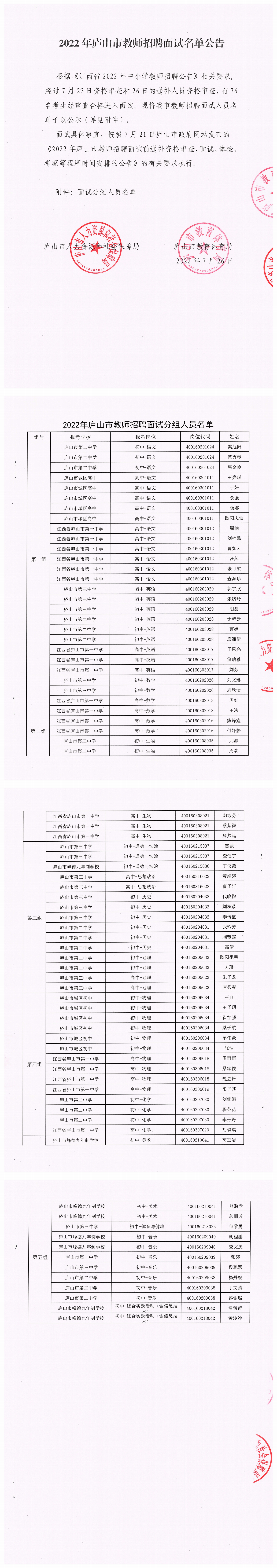 2022年庐山市教师招聘面试名单公告