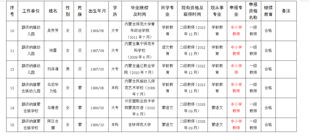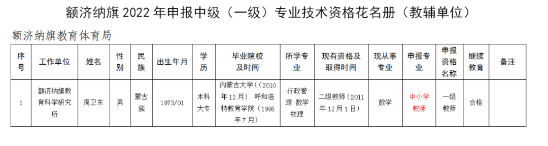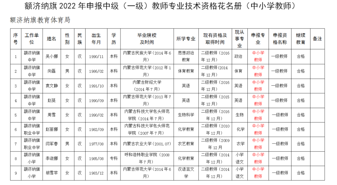 额济纳旗中小学教师系列评审委员会关于中级教师职称资格评审通过人员的公示