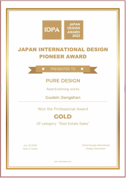 7月21日,设计界最具代表性的竞赛之一——IDPA AWARD日本国际先锋设计大奖公布评选结果,电建地产西南区域交投电建国宾江山示范区项目售楼部精装方案凭借领先的产品实力,经过多轮筛选,从全球众多参赛作品中脱颖而出,荣获2022年IDPA AWARD日本国际先锋设计大奖室内设计类金奖,有效扩大了电建地产品牌知名度和产品影响力。