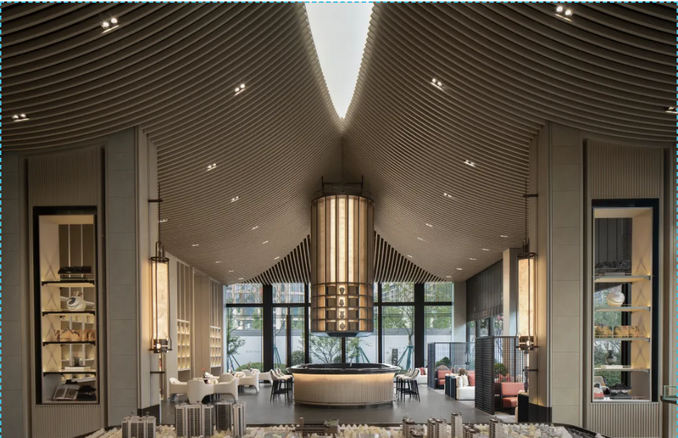 日本IDPA AWARD国际先锋设计大奖是面向全球征集最具国际行业知名度和行业影响力的设计师和设计机构的设计作品的国际设计大奖,在全球设计界有口皆碑。西南区域交投电建国宾江山示范区坐落于成都城西核心,占地面积约5000㎡,售楼部建筑面积约894.63㎡。整体示范区以宋风为境,将宋式民居和园林的特征提取和再译,再现宋代风雅恬淡、尊重自然的生活风雅于今日生活。售楼部室内设计延续传统的东方禅意,又特别将宋人的淡与极简引入,清淡而不寡淡,在这里,宋朝的极简隐贵美学、天青色等烟雨的纯粹浪漫,都在写意世界的笔触下娓娓道来。其中序厅内的古建装置,作为空间的焦点,既是设计在宋风概念下的一次显性表达,也让空间主题在此凝练。售楼处内部整体为对称的格局恰是东方礼序的传承和实现,极具仪式感与尊贵感,以山水为介质,素雅与极简形态的建筑内核是整体空间的第一印象。