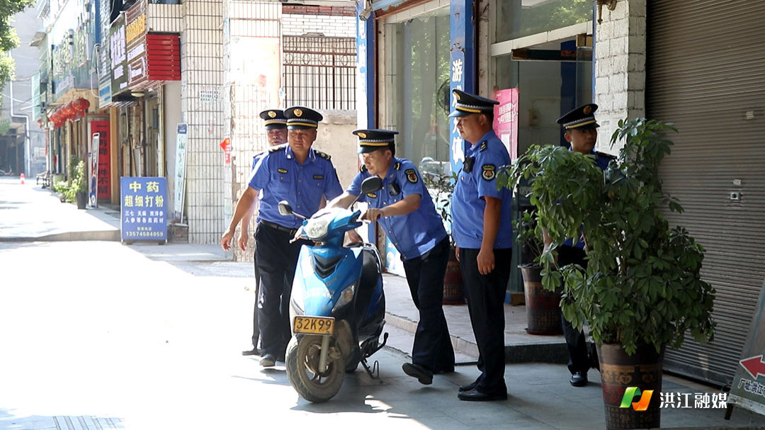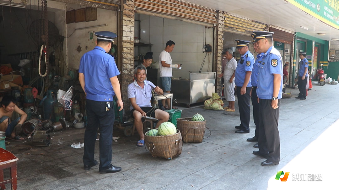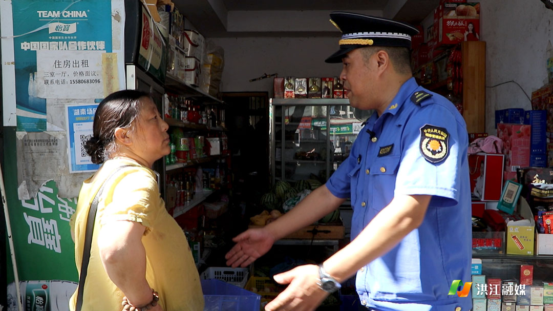 “你好老乡,根据怀化市市容管理相关条例,你这个不允许出店经营,你把这个移到里面去,你现在就开始移下,纠正这个违法行为。”