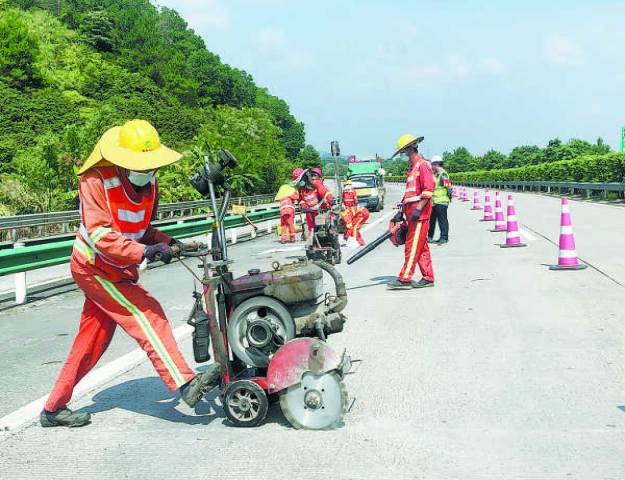 (通讯员 韦昌学 戴雨江 摄影报道)烈日当头,酷暑难耐,而炎热的盛夏却是养护公路的黄金季节。8月8日,在广西岑溪至广东罗定高速公路梧州市岑溪市境内路段,有一群养护人员顶着炎炎烈日、冒着高温酷暑,积极开展水泥混凝土路面填缝料更换养护工作。养护人员严格按照高速公路养护规范要求做好各种标志标牌设置等安全管理工作,并利用清缝机、钢刷机、吹风机、扫把等工具进行原填缝料清除、灌缝等施工。