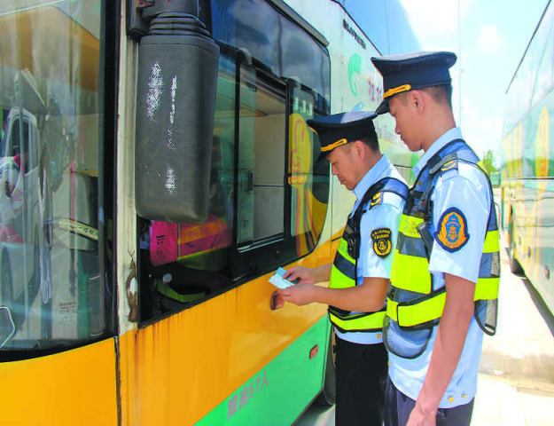 8月正值暑假,桂林市进入旅游高峰期。市区内“两站一场”、旅游景区、高校周边……总能看到桂林市交通运输综合行政执法支队执法人员的身影,他们在酷暑天勤检查、保秩序,脚印踏遍大街小巷,汗水浸透了衣衫,他们用坚守为群众创造安全有序的出行环境,不断提升群众的体验感、满意度。图为执法人员检查营运客车。(王蜜 海倩云/图文)