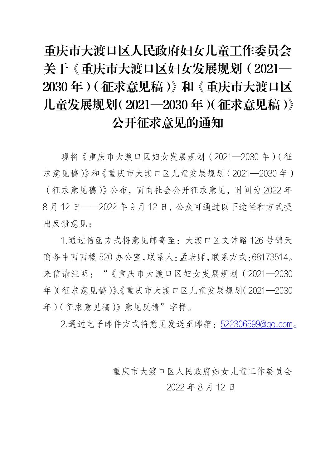 重庆市大渡口区人民政府妇女儿童工作委员会关于《重庆市大渡口区妇女发展规划(2021—2030年)(征求意见稿)》和《重庆市大渡口区儿童发展规划(2021—2030年)(征求意见稿)》公开征求意见的通知