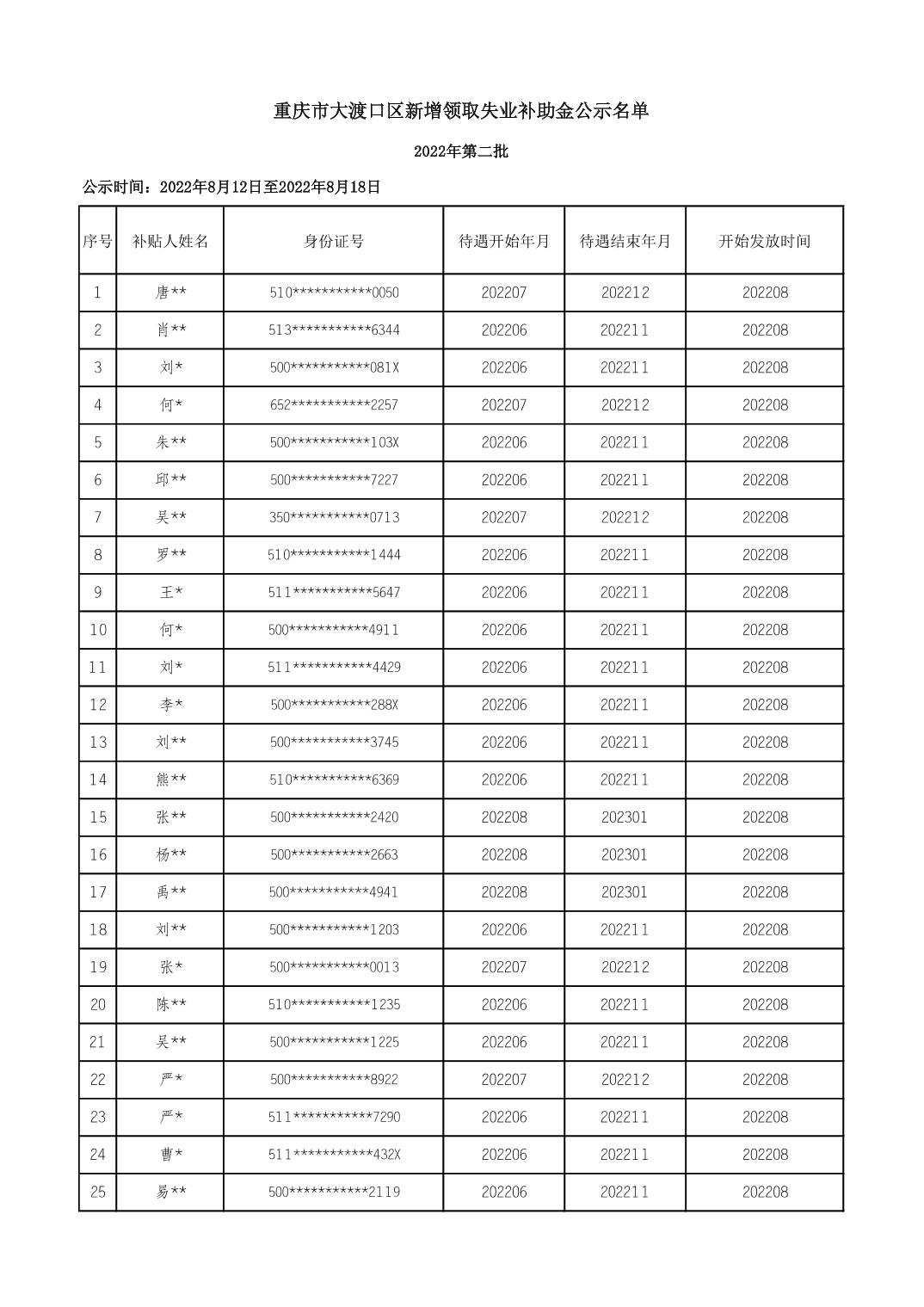 重庆市大渡口区新增领取失业补助金公示名单(2022年第二批)