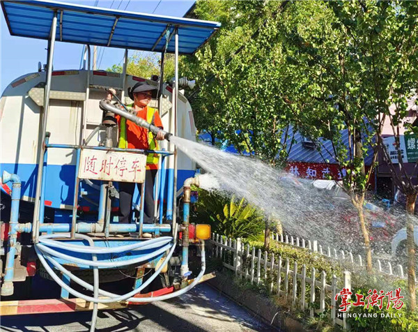 ▲园林绿化养护人员全力浇灌,为花草树木“消暑解渴”。