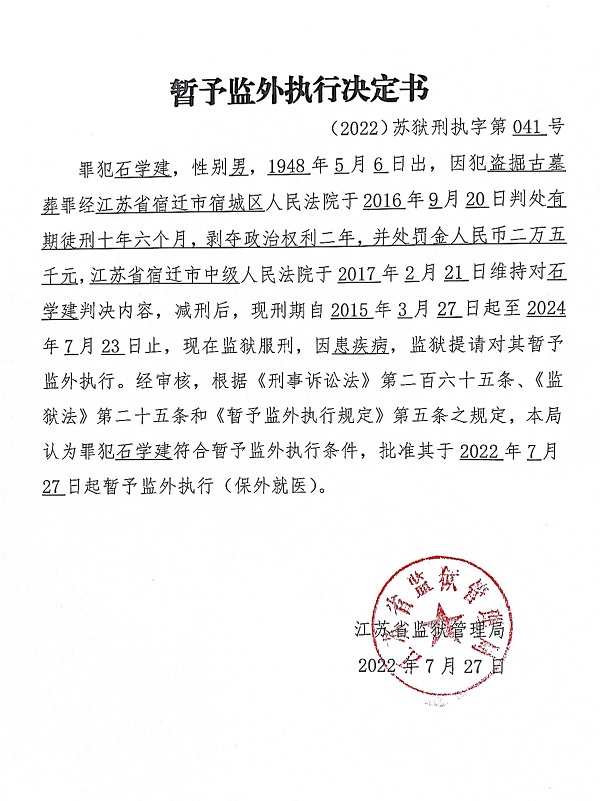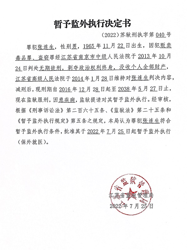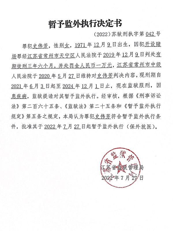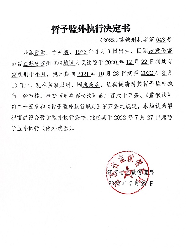 暂予监外执行决定书(2022)苏狱刑执字第040-043号