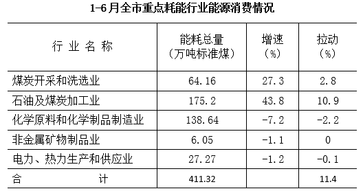 两升:煤炭开采和洗选业耗能64.16万吨标准煤,同比增长27.3%,拉动工业能耗增长2.8个百分点;石油及煤炭加工业耗能175.20万吨标准煤,同比增长43.8%,拉动工业能耗增长10.9个百分点。三降:化学原料和化学制品制造业耗能138.64万吨标准煤,同比下降7.2%,拉动工业能耗下降2.2个百分点;非金属矿物制品业耗能6.05万吨标准煤,同比下降1.1%,对工业能耗拉动几乎为0;电力、热力生产和供应业耗能27.27万吨标准煤,同比下降1.2%,拉动工业能耗下降0.1个百分点。