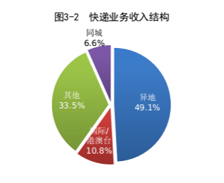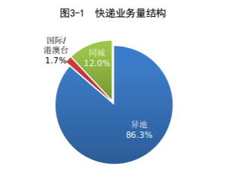 1-7月,同城、异地、国际/港澳台快递业务量分别占全部快递业务量的12.0%、86.3%和1.7%;业务收入分别占全部快递业务收入的6.6%、49.1%和10.8%。与去年同期相比,同城快递业务量的比重下降1.2个百分点,异地快递业务量的比重上升1.6个百分点,国际/港澳台业务量的比重下降0.4个百分点。