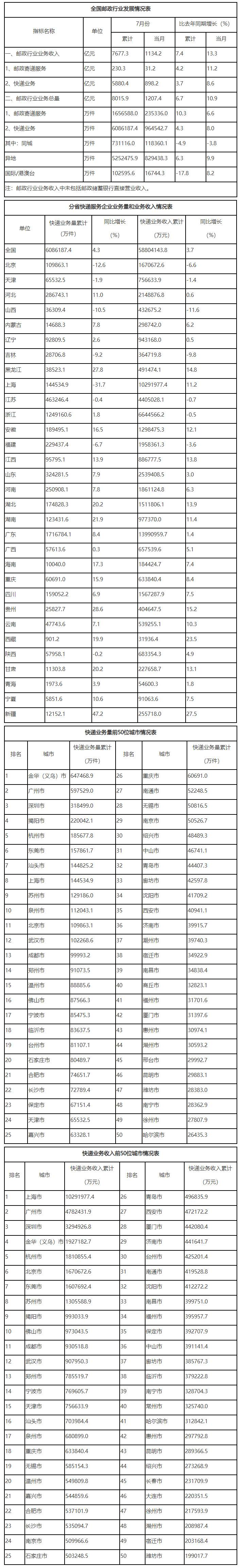 7月份,全行业业务收入完成1134.2亿元,同比增长13.3%;业务总量完成1207.4亿元,同比增长10.9%。