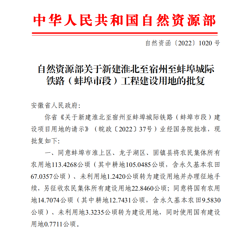淮宿蚌城际铁路(蚌埠市段)工程建设用地正式获批