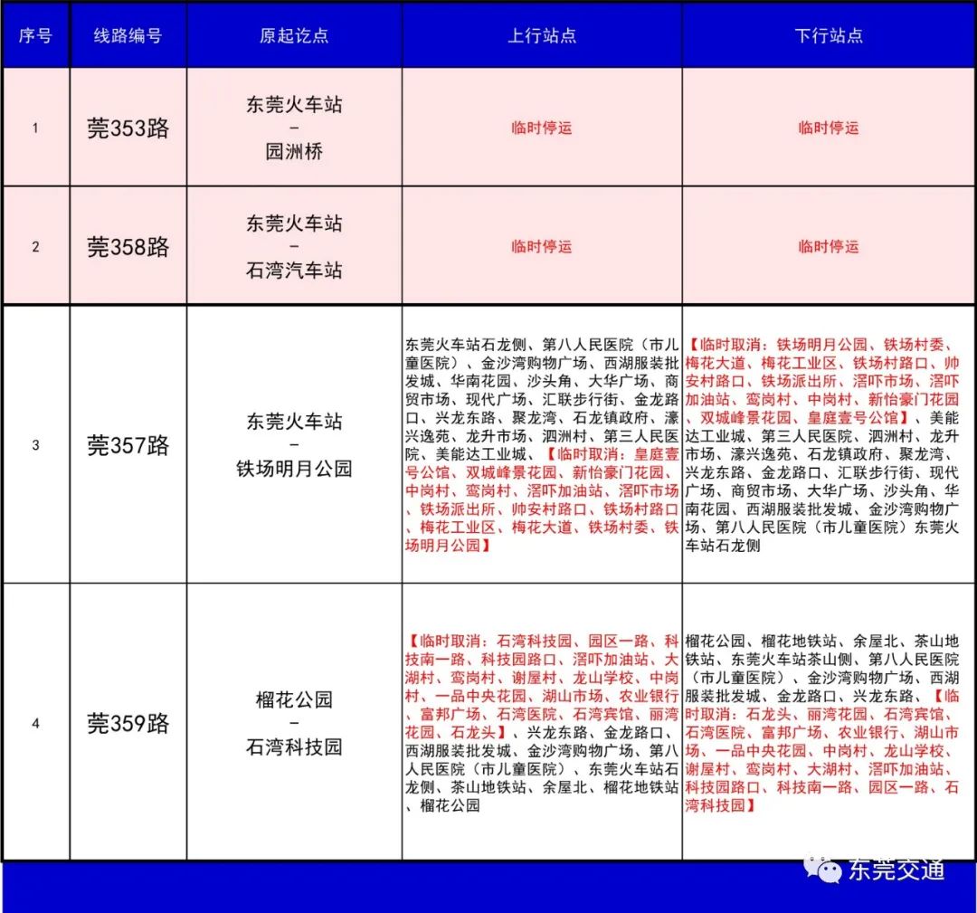 莞357路(东莞火车站-铁场明月公园)截短至“美能达工业城”,莞359路(榴花公园-石湾科技园)截短至“兴龙东路”,上述两条线路取消停靠惠州区域公交站点。