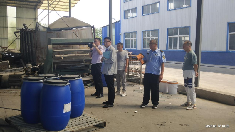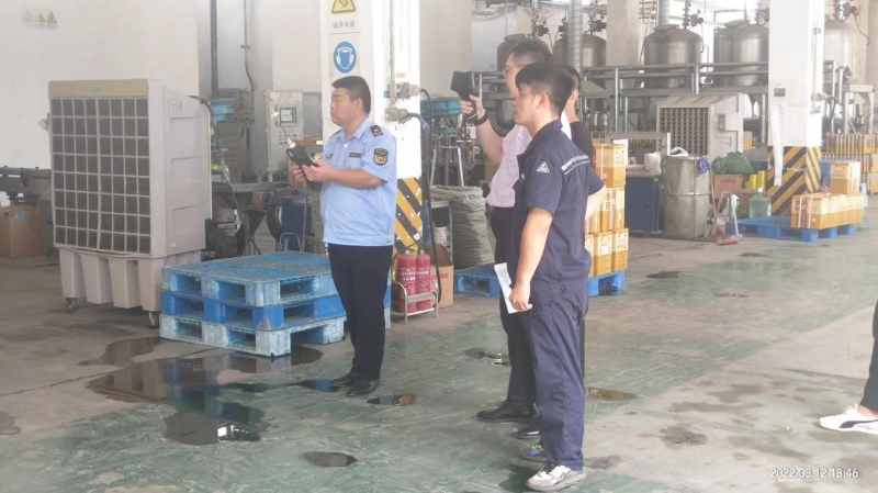 在现场检查过程中,执法人员的衣裳被汗水浸湿,他们仍旧对企业厂区范围内的废气处理装置和原料储罐逐个进行检查,对于企业负责人员询问设备方面的问题进行详细解答,现场指导企业对装置进行维护和检查,确保装置正常运行。