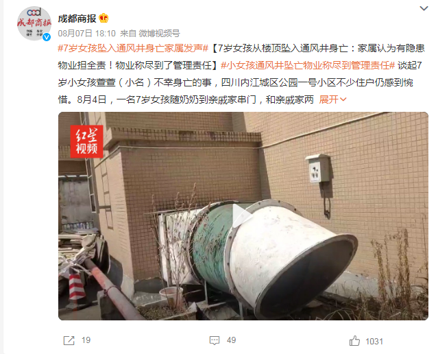 据悉,该栋楼共有26层,事发后,楼顶排风管与通风井连接处出现了一个“洞”,小女孩是在负二楼的通风井内被消防员找到的,且已无生命迹象……
