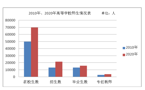 从1999年全国实施高校扩招以来,全市高等教育在校学生数、招生数、毕业生数以及专任教师数都呈逐年上升趋势。2020年,全市共有高等学校6所,比2010年增加1所;在校学生数69752人,比2010年增加19885人,增长39.9%;招生数21457人,比2010年增加8300人,增长63.1%;毕业生15770人,比2010年增加2596人,增长19.7%;专任教师3842人,比2010年增加903人,增长30.7%。高等学校在校生数与毕业生数2010年至2020年保持高速增长,学生人数的不断增长带来专任教师人数平稳增长。