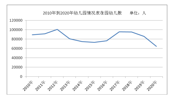 2020年,全市幼儿园共971所,比2020年减少37所,在园幼儿数64603人,比2010年减少24525人,下降27.5%;教职工8545人,比2010年增加5006人,增长1.4倍。十年间在园幼儿数出现两次转折。第一次出现在2012年,在园幼儿数高达100726人,主要原因是2006年至2009年全市保持较高人口出生率,新生儿增加带来学龄前儿童增加;第二次出现在2017年。2011年以来随着人口减少,已婚育龄妇女人数减少,出生率不断下降,学龄前儿童逐渐减少,直至2015年国家全面放开“二胎”政策,一定程度刺激了出生人数增长,出现2017年至2018年在园幼儿数的增长。