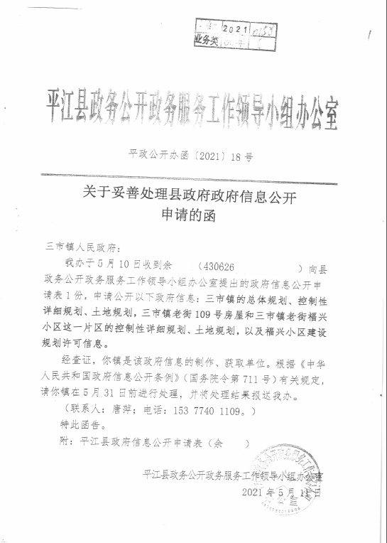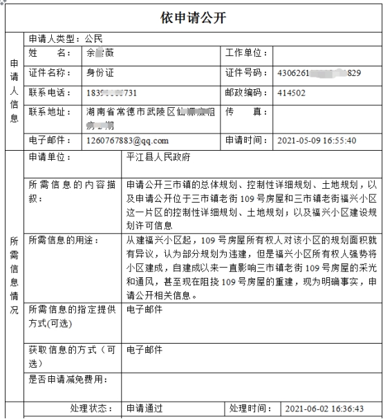 2021年5月9日,公民余某某通过平江县政府门户网政府信息依申请公开平台,向平江县人民政府提交政府依申请公开件。平江县政务公开办按规定程序,依法予以受理,并及时予以公开。