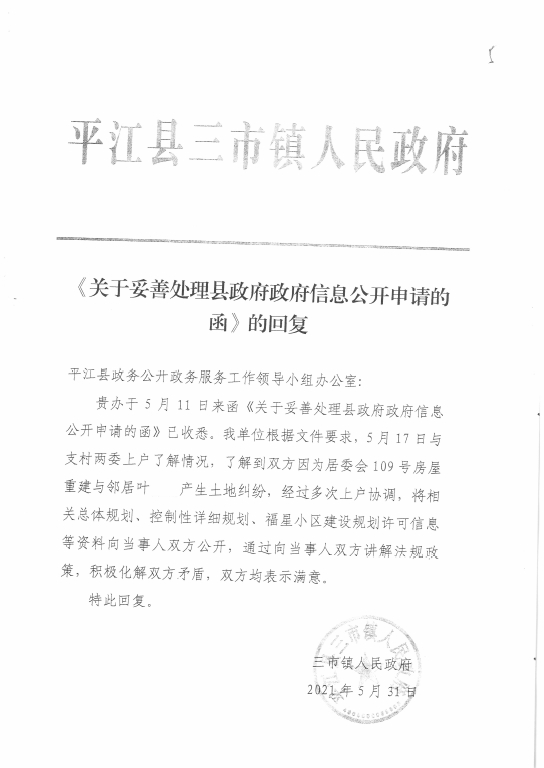 2021年5月31日,三市镇人民政府回复我办,表示已按我办要求,向当事双方公开了相关总体规划、控制性详细规划、福兴小区建设规划许可等信息,并通过上门协调,讲解相关法律法规,化解了双方矛盾,双方均表示满意。