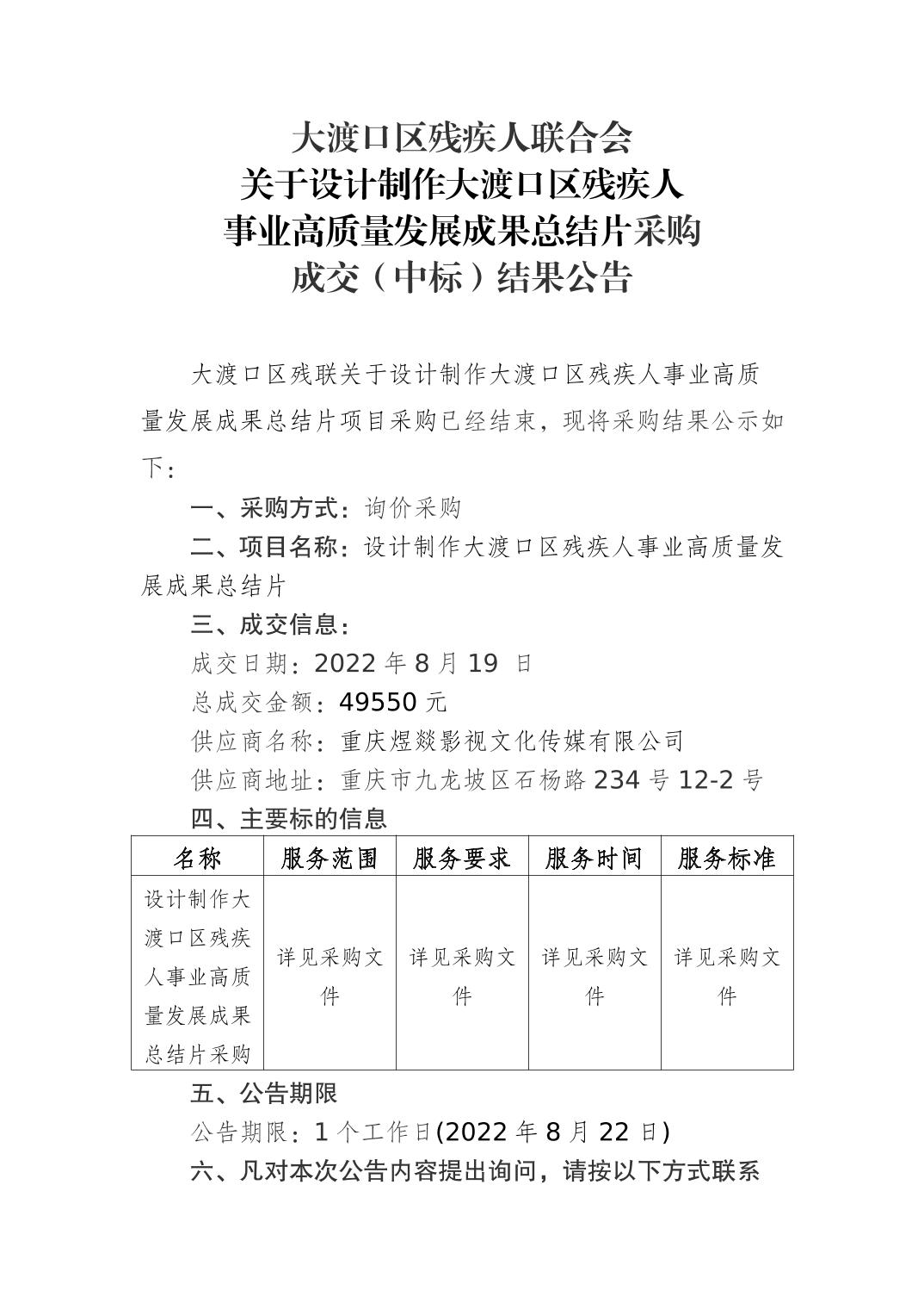 大渡口区残疾人联合会 关于设计制作大渡口区残疾人 事业高质量发展成果总结片采购 成交(中标)结果公告