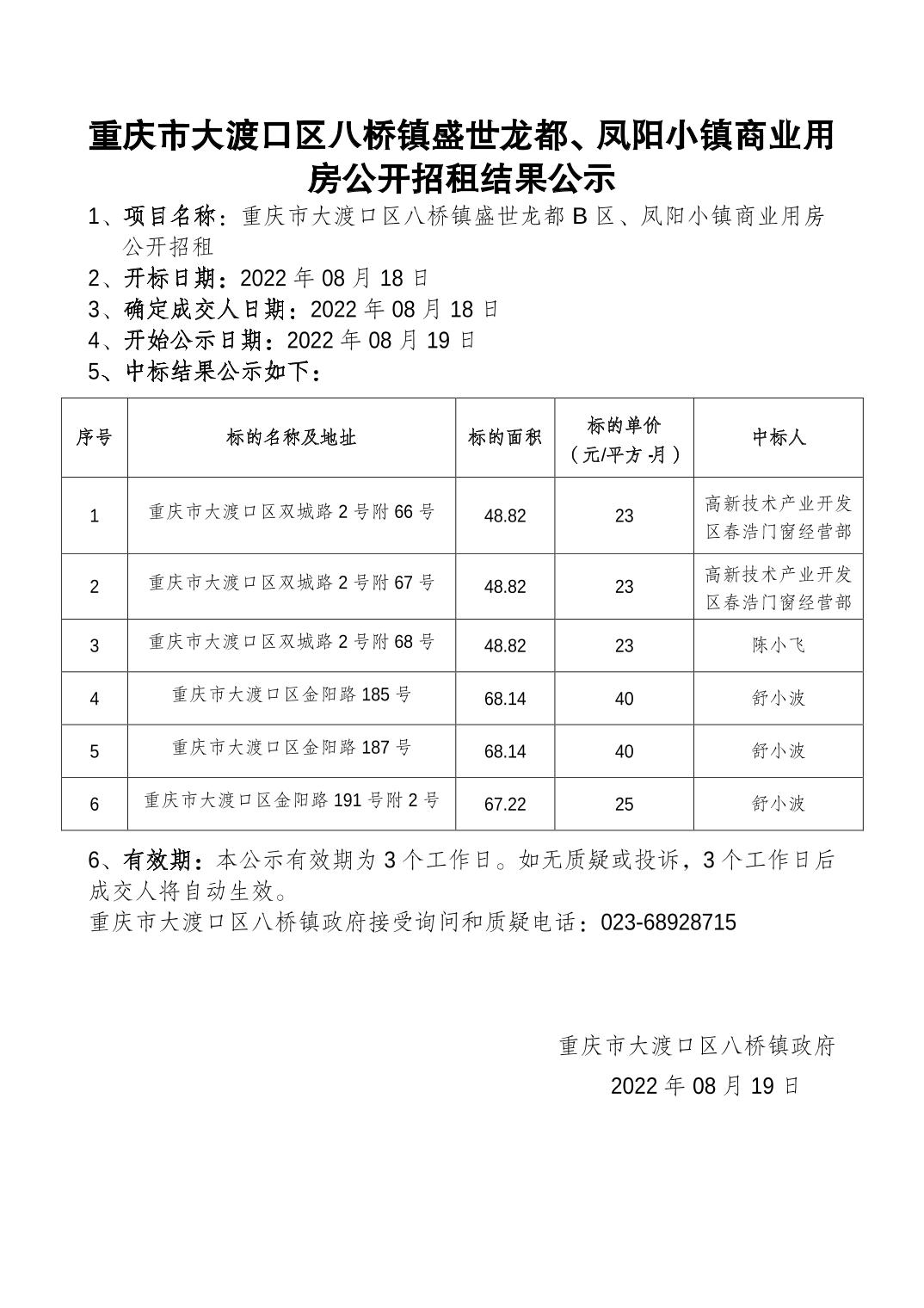 重庆市大渡口区八桥镇关于盛世龙都、凤阳小镇商业用房公开招租结果的公示