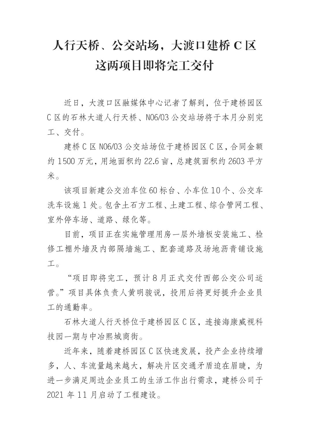 人行天桥、公交站场,大渡口建桥C区这两项目即将完工交付