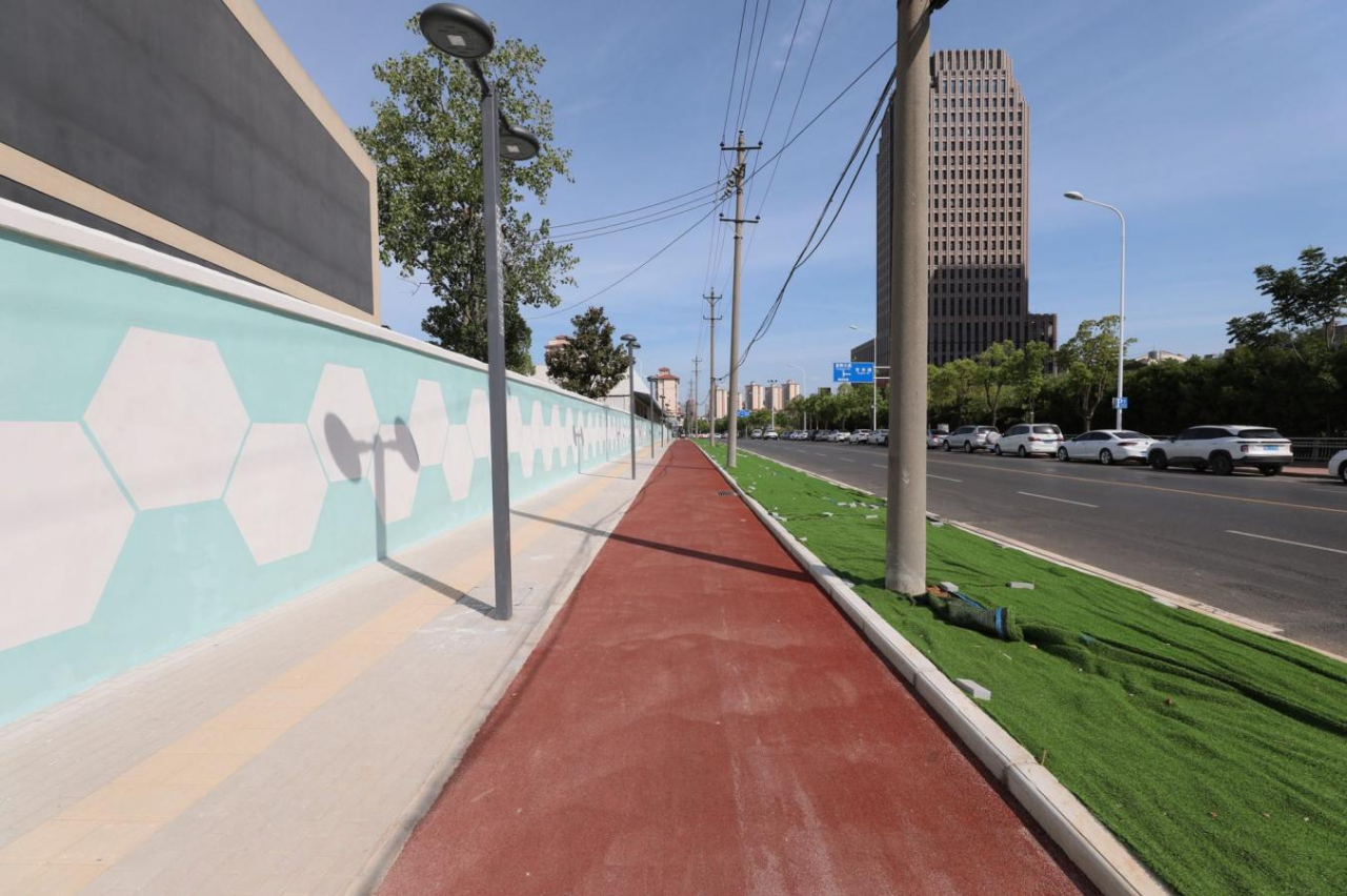 “这条道路不仅方便我们出行,还美观,走起来蛮舒服。”市民张先生高兴地说道,红色沥青路面、灰黑色步砖及淡蓝色彩绘围墙结合,形成一条色彩鲜明颇具特色的休闲步道,行走其间舒心又养眼。