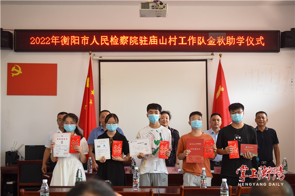 8月24日,市检察院和常宁市罗桥镇庙山村村支两委共同举行“金秋助学”资助金发放仪式。仪式上,庙山村今年考上大学的5名困难学子每人获得3000元资助。