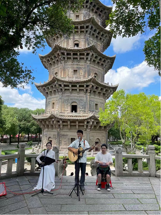 “古早南门有船入港,海上丝绸万里航”“南音讲古茶清香,甜点蜜味请客人”……一曲《刺桐》唱不完“涨海声中万国商”的繁华,道不尽“半城烟火半城仙”的闲适。该歌曲由原创音乐人张波作词、作曲并演唱,结合吉他、琵琶、手鼓等乐器,将闽南语民谣与泉州南音、梨园戏融合编曲。“歌词改了两次,原来是普通话版本,最终决定用闽南语来唱出我对泉州的感受,更加原汁原味。”张波介绍道。