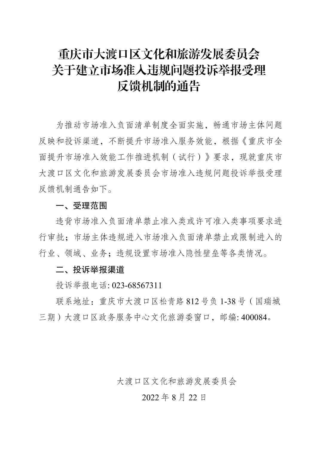 重庆市大渡口区文化和旅游发展委员会关于建立市场准入违规问题投诉举报受理反馈机制的通告