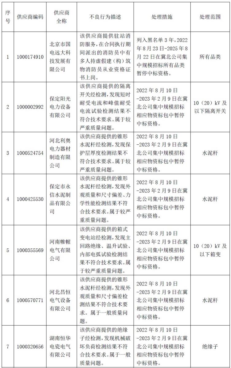 6起涉及产品质量问题,被处以相应产品自2022年8月10日-2023年2月9日,在冀北公司集中规模招标相应物资标包中暂停中标资格的处罚。