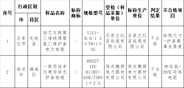 不合格样品的标称企业分别为:石家庄红星线缆有限公司、保定鹏辉电力器材有限公司。和受检(样品采集)单位一致。