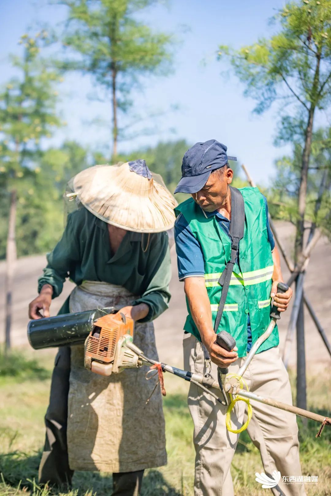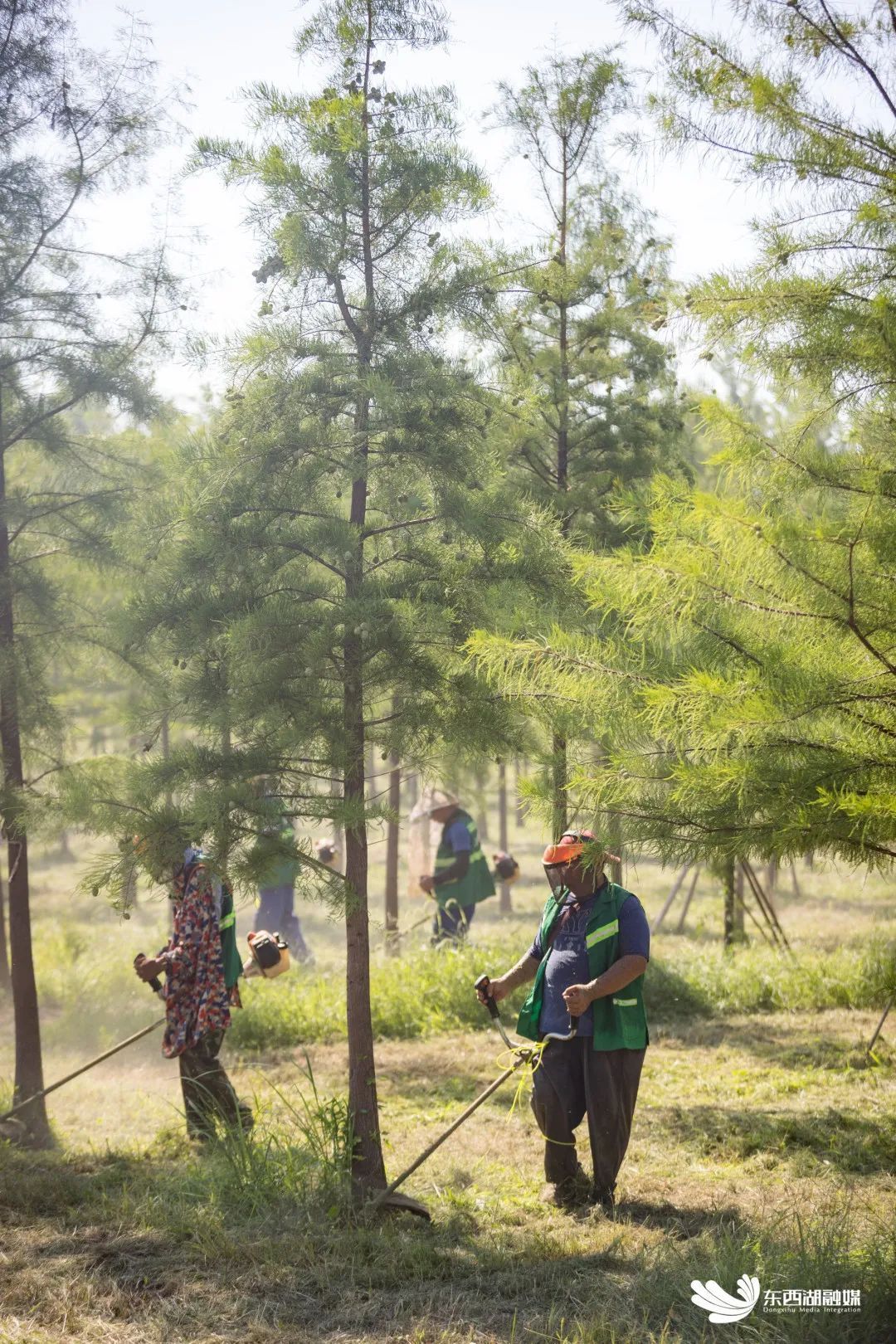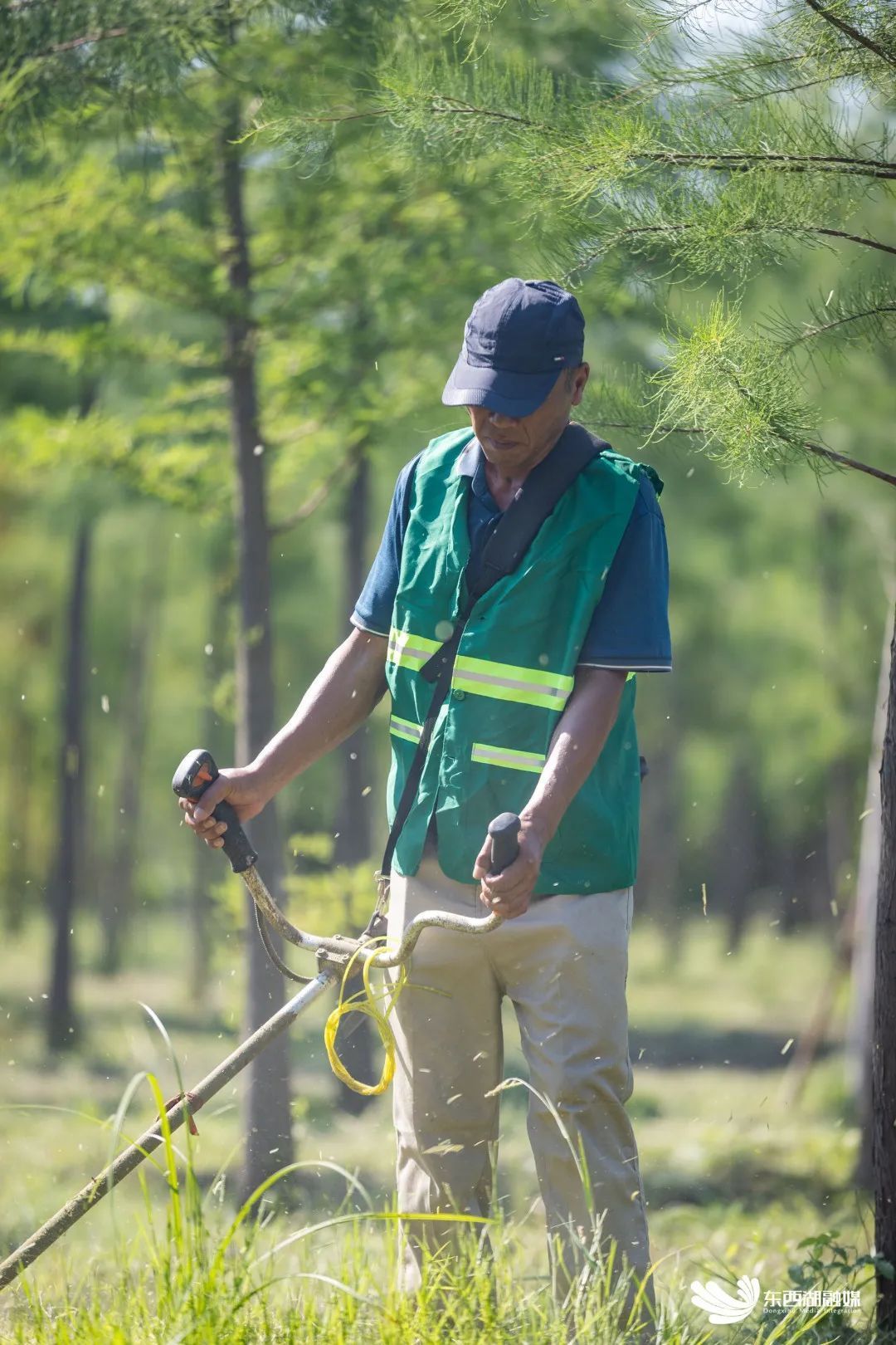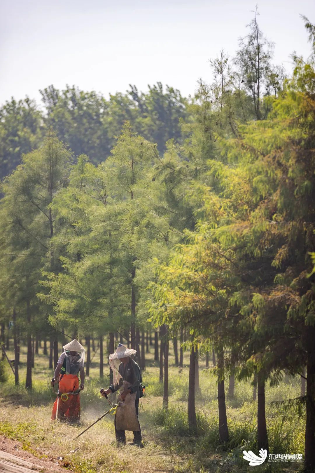 10人除草队一字排开,齐头并进,树下杂草齐刷刷倒下。郁郁葱葱的水杉林里,露出整齐的坡面。