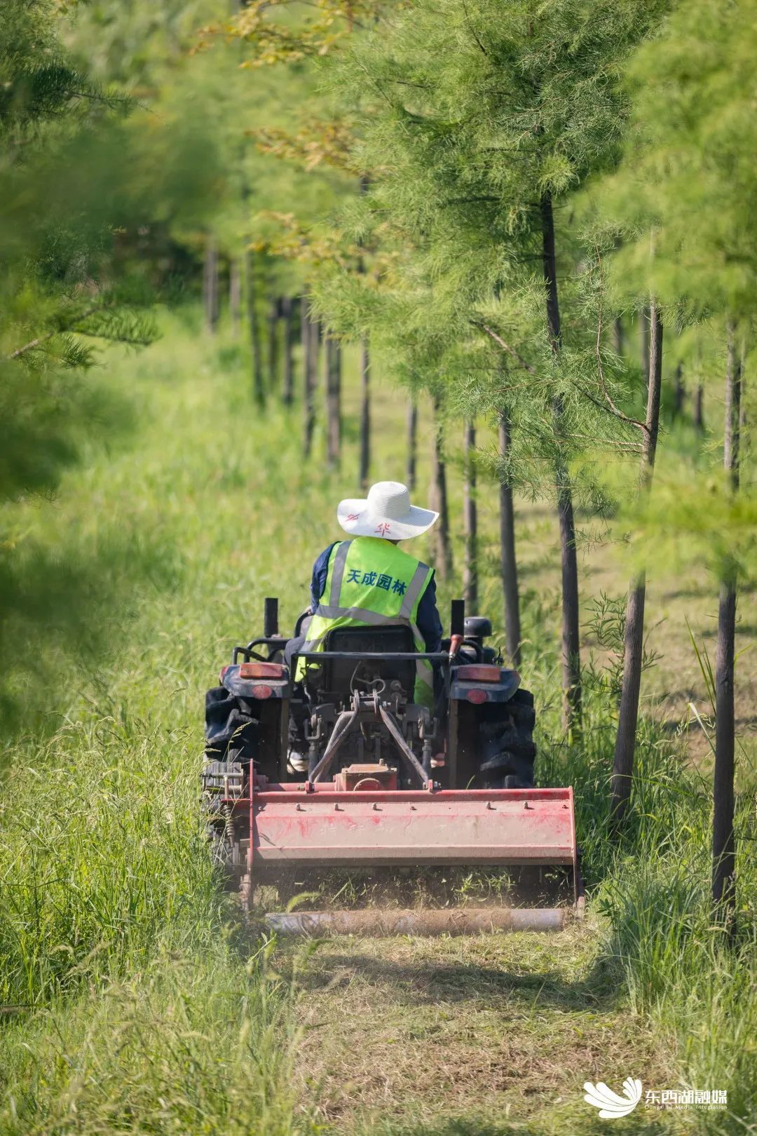 汉江干堤上机器轰鸣,2台机械碎草机在杉林间快速行进,半米高的杂草瞬间被粉碎。工人们头戴草帽和防护面罩,架着割草机,动作娴熟。