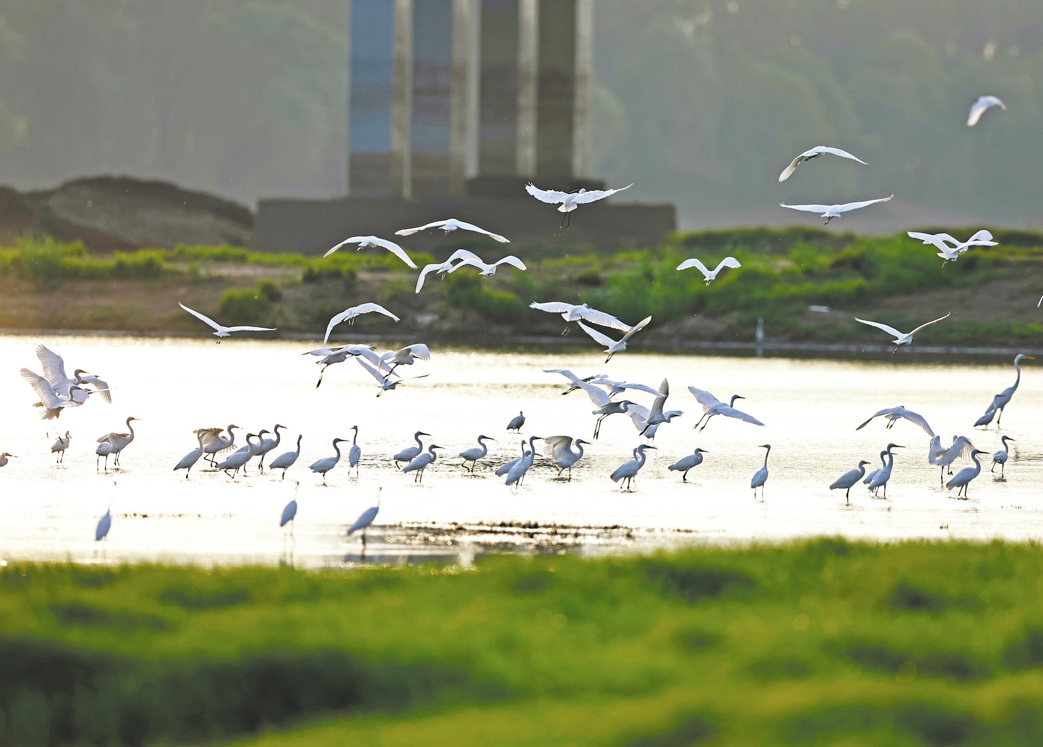 8月25日,在武汉市东西湖区府河河滩上,夕阳映照河面,大批白鹭在此觅食、栖息。目前翔集于府河的主要是白鹭和中白鹭,每年8月至9月,鸟群在武汉繁殖后会集群休整,多见于府河河滩,待到9月底便往广东、云南等地迁徙,更远可飞到东南亚。