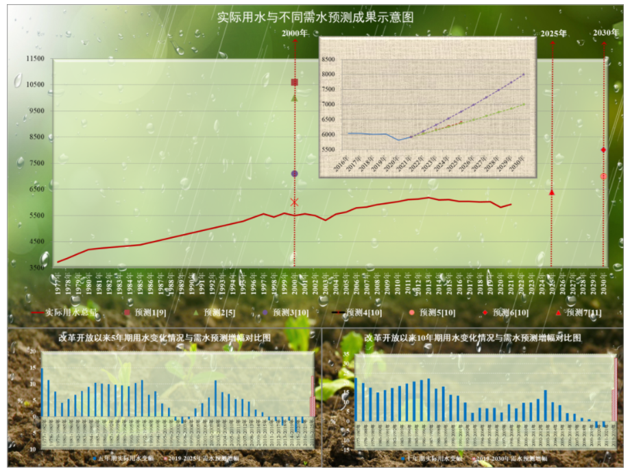 在改革开放以来实际用水量的基础上,若套用已有的2025年、2030年需水预测成果(考虑2020年受疫情影响,以2019年为基数),则2019-2025年和2019-2030年两个阶段用水量变化态势可能是40年来增幅最大的5年期、10年期,如下图所示。
