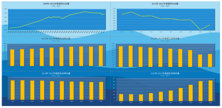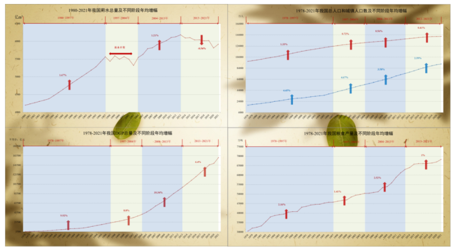 1980~2021年(改革开放以来)我国用水总量增幅明显回落,年均增幅约0.84%。不同于前一阶段,虽然我国粮食产量不断增加,但农业用水量基本不变或变幅极小,生活、工业、生态用水对总用水量的影响作用较大。