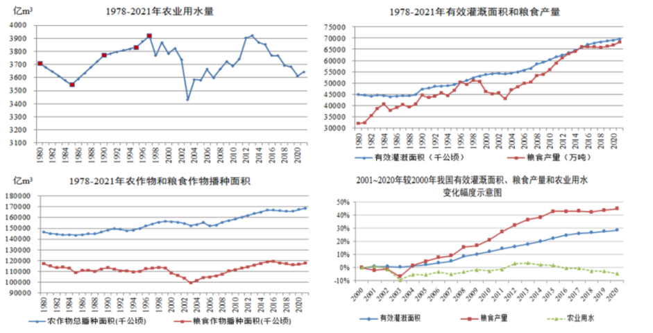 2021年我国有效灌溉面积约10.4亿亩,粮食产量约13657亿斤,分别较2000年增加了29.3%和47.7%。农田灌溉水有效利用系数由2000年的0.43增加至2021年的0.568,农业用水较2000年减小了3.7%左右。需要说明的是,农业灌溉用水受天然来水影响大,2003年以前的几年时间粮食产量和农业用水降低,从来水条件看,并非供水能力不足导致,需进一步从粮价、种粮积极性等角度分析原因。