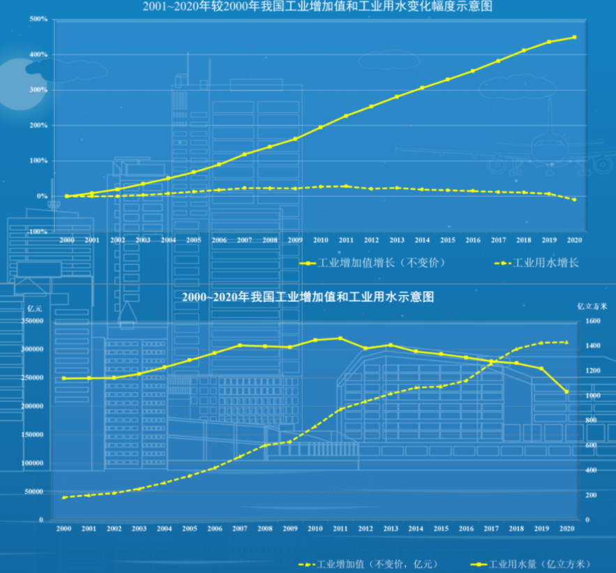 图3 2001~2020年我国工业增加值和工业用水较2000年变化幅度对比示意图