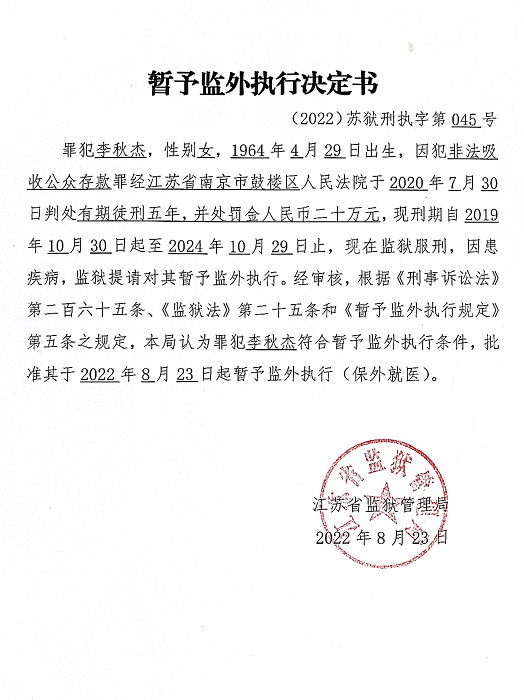 暂予监外执行决定书(2022)苏狱刑执字第045号