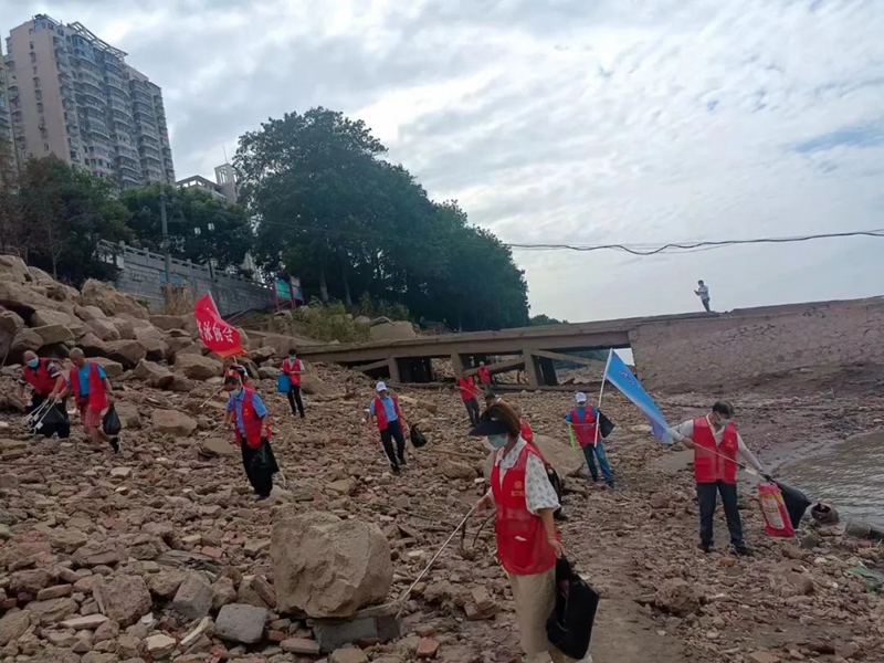 凤凰街道菜园头社区组织未成年人志愿者,青年志愿者,党员志愿者和城管队员一道到江边开展“净滩行动”
